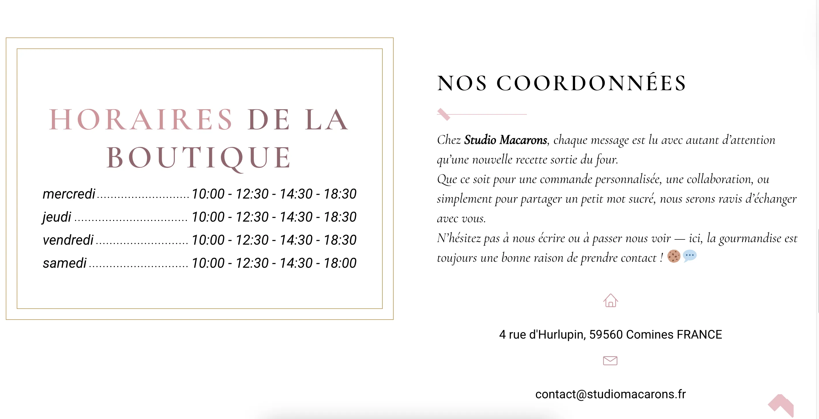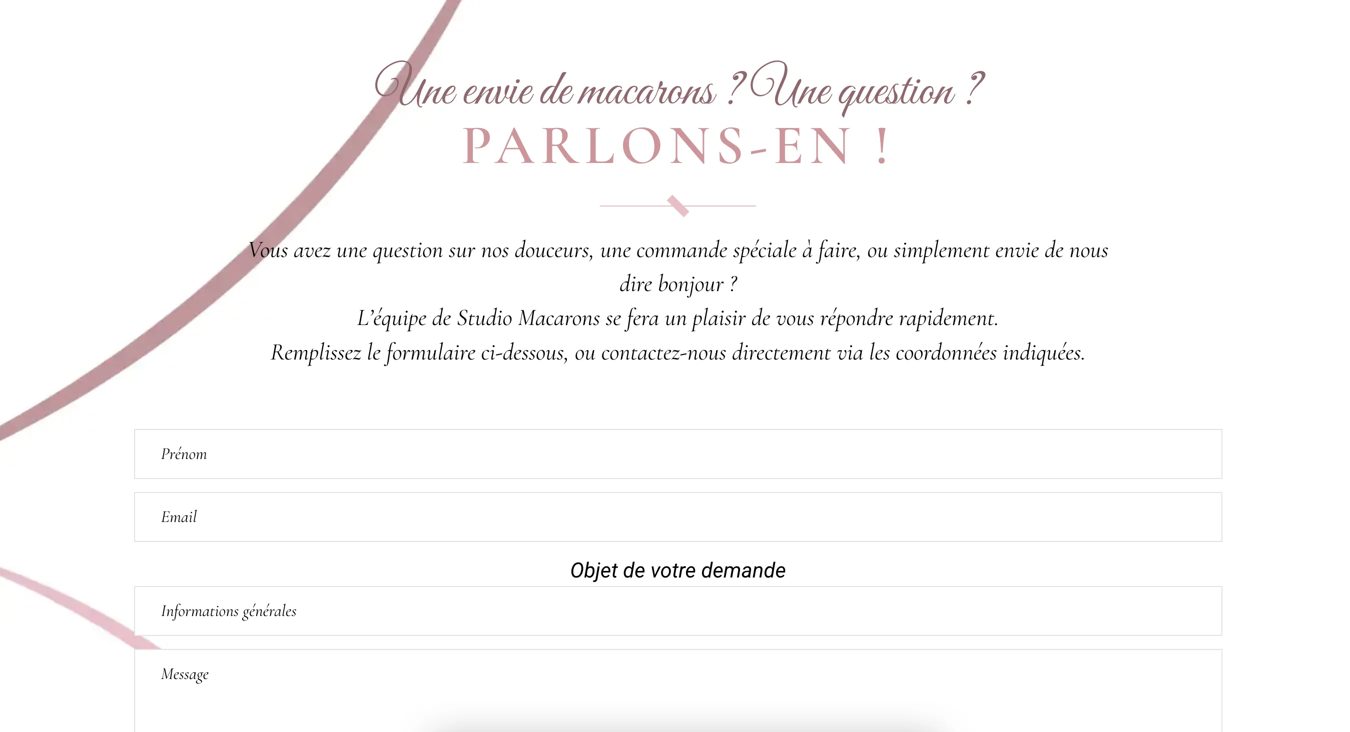 Une page de contact optimisée pour une simplification des réception emails (les visiteurs doivent choisirent un objet dans un menu déroulant, qui sera visible par Studio macaron sur leur boite email : de quoi faciliter les réponses et trier facilement les emails)